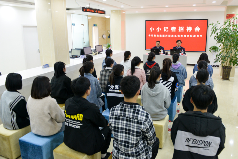 3月15日下午,两会记者招待会刚刚结束,国家税务总局开封市顺河回族区税务局办税服务厅一场别开生面的小小记者招待会正在进行。来自开封青少年税法宣传基地——河南省工商管理学校的税收宣传小使者们面对面采访税务工作人员和纳税人,零距离直击减税降费。