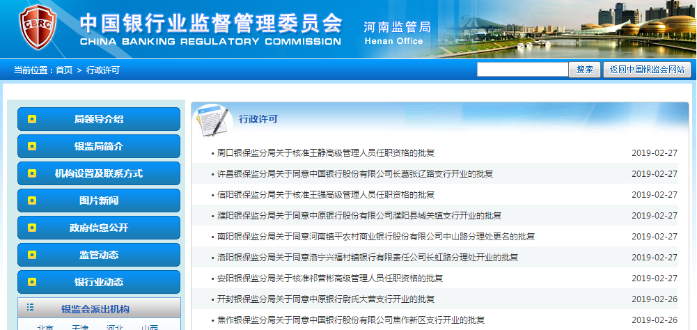 河南银保监局:批准4家银行支行开业、3名行长任职资格