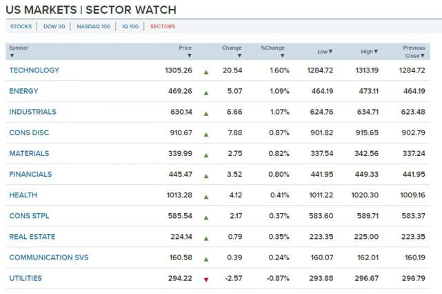 标普500指数11个板块中有10个板块上涨,其中科技和能源板块领涨,仅有公用事业板块下跌。