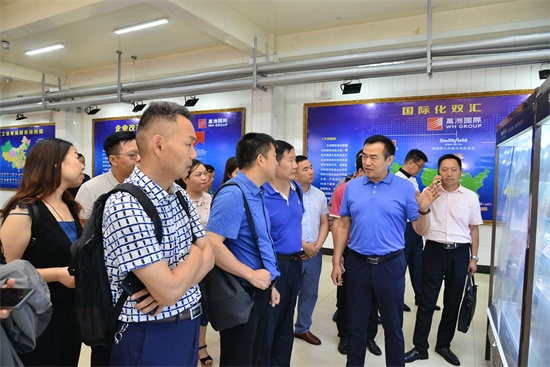在双汇产品展厅,双汇发展副总裁周霄向体察团一行简要介绍企业发展壮大历程和工业布局,并就企业在食品安全、产品创新等方面取得的成绩进行沟通交流。