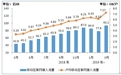 电信业务使用情况方面,一季度,移动互联网累计流量达256亿GB,同比增长129.1%;其中通过手机上网的流量达到255亿GB,同比增长133.2%,占移动互联网总流量的99.5%。3月当月户均移动互联网接入流量(DOU)达到7.27GB,同比增长121.1%。