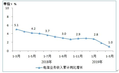 从总体运行情况来看,电信业务收入增速继续放缓。一季度,电信业务收入累计完成3323亿元,同比增长1.0%,增速同比回落4.1个百分点,较1-2月回落0.9个百分点。