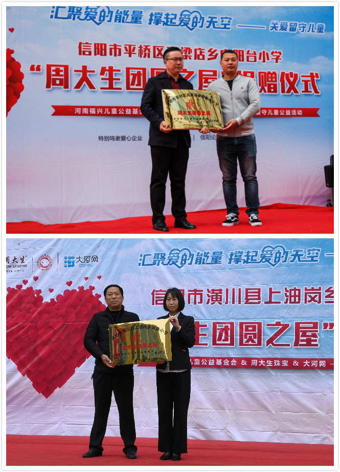 大河网讯 最美人间四月天。4月10日-11日,“汇聚爱的能量·撑起爱的天空”周大生关爱留守儿童活动第28、29站分别在信阳市平桥区高粱店乡申阳台小学、潢川县上油岗乡宋寨小学举行,周大生“团圆之屋”正式落户两校,让两所学校300多名的留守儿童在这个充满希望的春天里享受到更多的关爱和温暖。