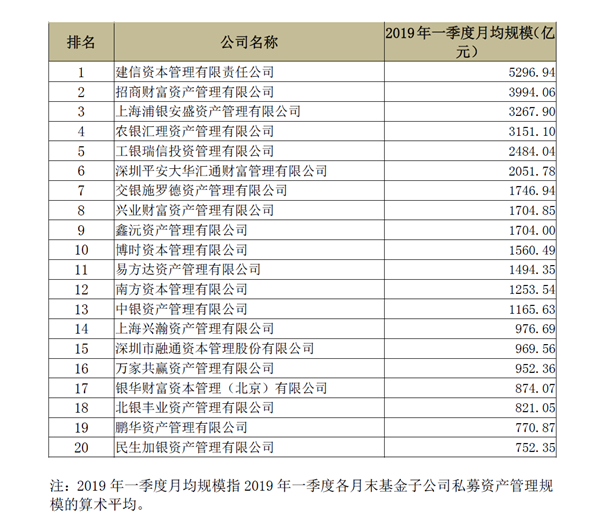 日前,中国证券投资基金业协会发布的一季度基金子公司私募资产管理月均规模排名显示,银行系“独占鳌头”。排名前三的是建信资本管理有限责任公司、招商财富资产管理有限公司、上海浦银安盛资产管理有限公司,2019年一季度基金子公司私募资产管理月均规模分别为5296.94亿元、3994.06亿元、3267.9亿元。