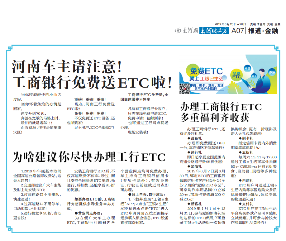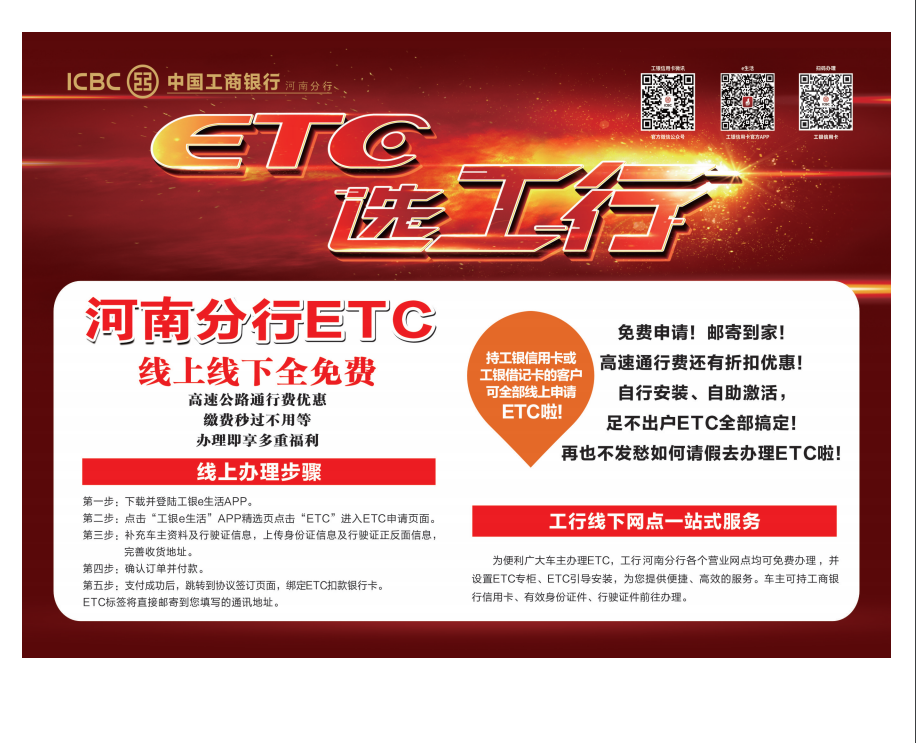 凡持有工商银行卡客户,只需在线免费申请ETC,免费申请!包邮到家!