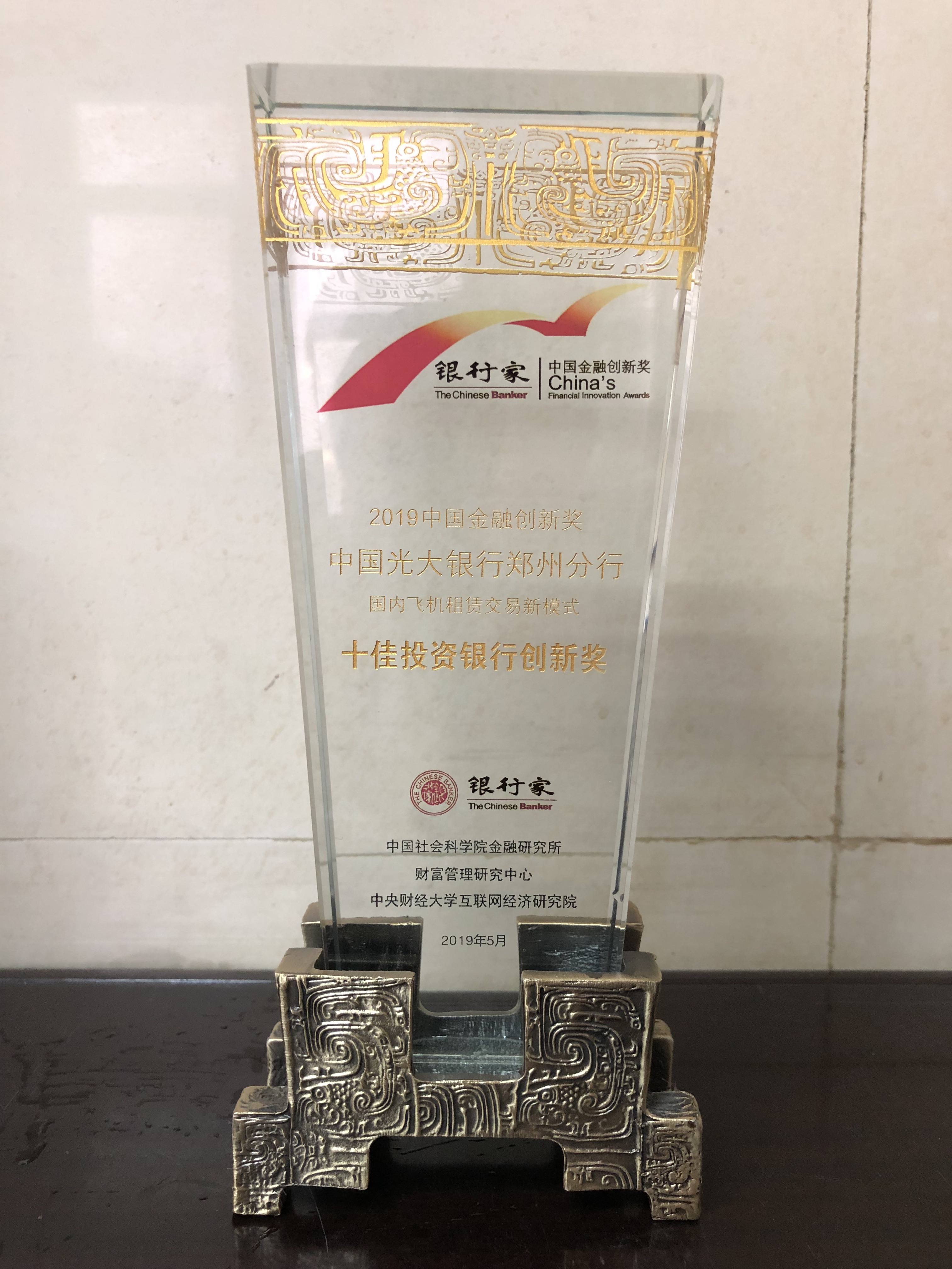 光大银行郑州分行“国内飞机租赁交易新模式” 荣获《银行家》“十佳投资银行创新奖”