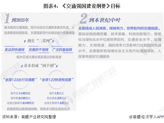 2019年9月,中共中央和国务院印发《交通强国建设纲要》,计划到2035年,基本建成交通强国。现代化综合交通体系基本形成,人民满意度明显提高,支撑国家现代化建设能力显著增强;拥有发达的快速网、完善的干线网、广泛的基础网,城乡区域交通协调发展达到新高度;基本形成“全国123出行交通圈”(都市区1小时通勤、城市群2小时通达、全国主要城市3小时覆盖)和“全球123快货物流圈”(国内1天送达、周边国家2天送达、全球主要城市3天送达),旅客联程运输便捷顺畅,货物多式联运高效经济;智能、平安、绿色、共享交通发展水平明显提高,城市交通拥堵基本缓解,无障碍出行服务体系基本完善;交通科技创新体系基本建成,交通关键装备先进安全,人才队伍精良,市场环境优良;基本实现交通治理体系和治理能力现代化;交通国际竞争力和影响力显著提升。到本世纪中叶,全面建成人民满意、保障有力、世界前列的交通强国。基础设施规模质量、技术装备、科技创新能力、智能化与绿色化水平位居世界前列,交通安全水平、治理能力、文明程度、国际竞争力及影响力达到国际先进水平,全面服务和保障社会主义现代化强国建设,人民享有美好交通服务。