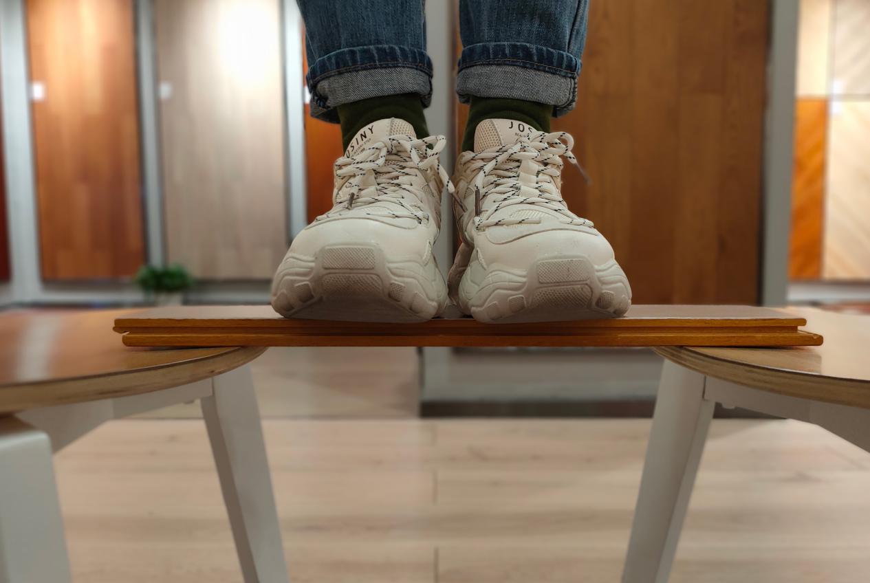 小编为求证实铁苏木的硬度,鼓起勇气站立在架空的单片地板上,10分钟过后近距离水平观察地板,地板仍然完好无弯曲变形。由此可见安信铁苏木实木地热地板的确拥有铁一般的品质和铁一般的稳定。