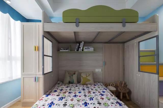 另外,两个小孩平时的玩具、书本都可以放在中间的置物架、书柜上,提高了卧室的收纳能力,增加了储物空间,一举两得。