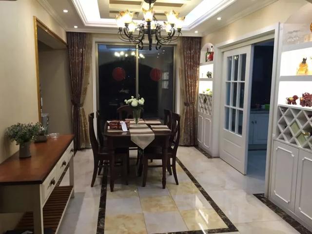 利用餐厅侧面的墙面来做个嵌入式的柜子,把酒柜和餐边柜结合起来,嵌入式的柜子不占用餐厅的面积,非常实用。