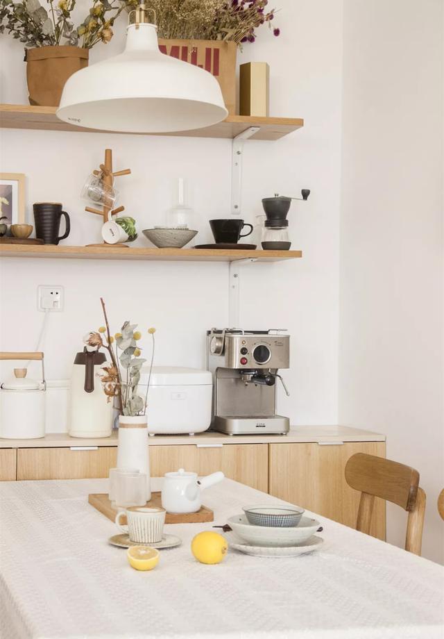 厨房台面太少,小家电大多挪出来,放在餐边柜上面。墙上加了两道搁板,高度间距30cm,深25cm,可以放置许多餐具,这里自然成了简易咖啡角。