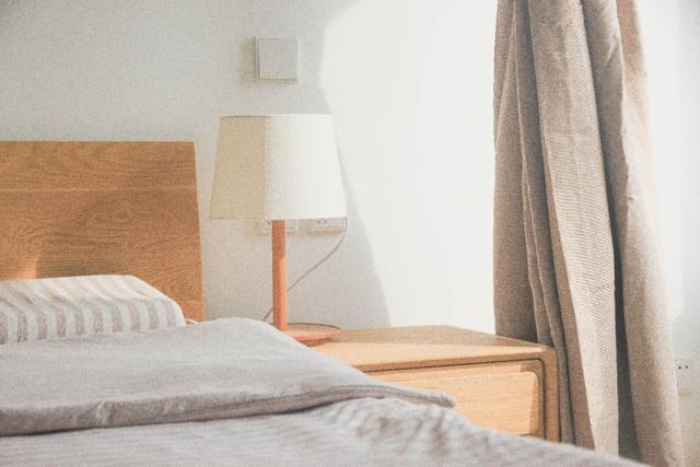 另一边空间宽裕,床头柜是常规款式,白橡木,纹理分明。
