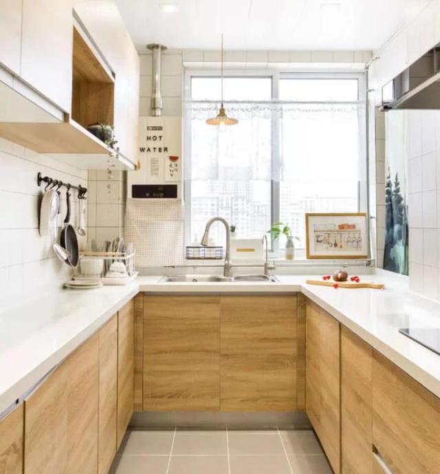 厨房内部是做了U字形的橱柜布局方案,把水槽放在靠窗的一些,灶台上方不做吊柜,再加上简单的配色方案,厨房整体给人一种温馨、明亮的感觉。