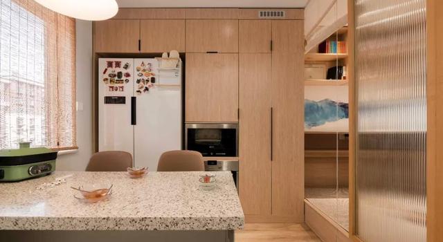 厨房和餐厅地砖选用了黑白几何纹路的,给空间增加填一些活泼的元素。餐桌和橱柜一起做定制化设计。