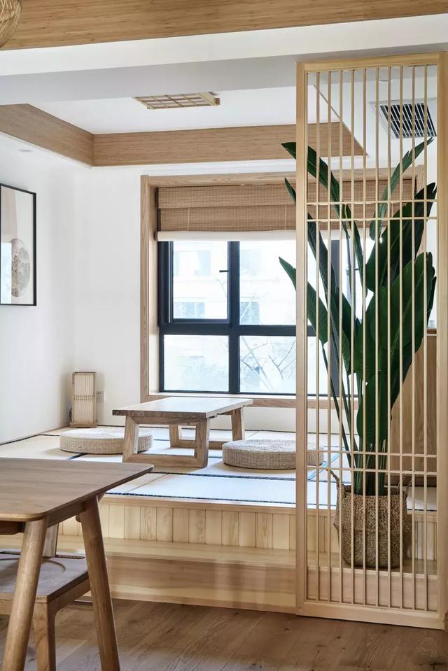传统日式家居中都会有一个特定的空间来做和室,用障子门围绕,可以全封闭,也可以全开,在客厅和茶室之间切换。