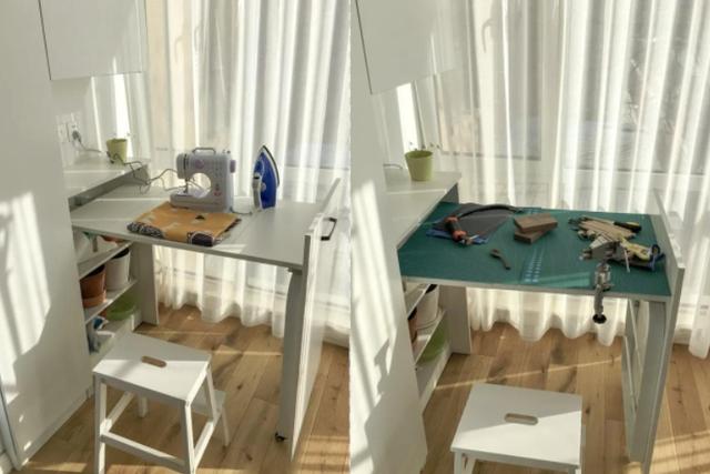 但在柜子右下角“暗藏玄机”,这组柜门内置了折叠柜板,底部装了小滚轮,用拉手抽开柜门,把折叠板摊开,便立即成为一个牢固不晃动的小桌子,桌面宽度大约在45cm,长度在80cm左右。此处可临时办公,也可以用于做手工,当工具桌也是不错的。