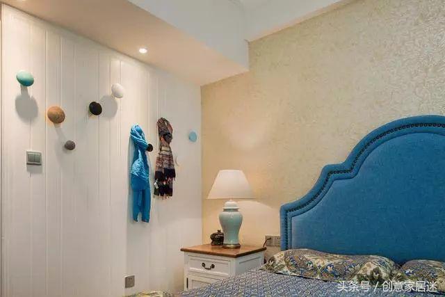 ▲床侧边的墙面以护墙板作为装饰,上面安装有颜色各异的蘑菇型挂钩,既是装饰,也方便挂衣物。
