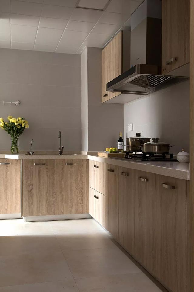 ▲厨房暖灰色的墙面与地砖,搭配木色的橱柜,让做饭的空间温馨而又简洁自然。