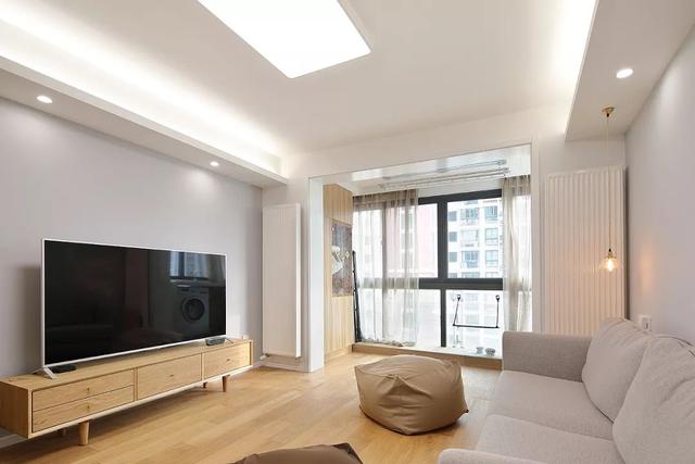 ▲简洁的电视墙,搭配米白色布艺沙发,阳台门垛两侧还挂上暖气片,没有茶几的客厅布置,打造出一个安全舒适的休闲放松空间。