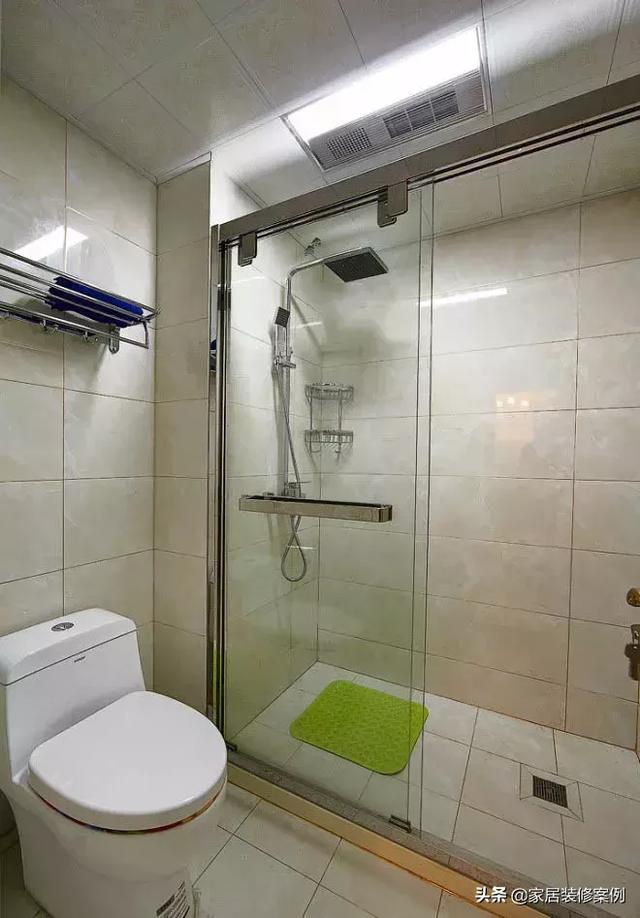 卫生间马桶与淋浴区用玻璃推拉门隔开,有效的干湿分离设计,可以防止洗澡时水花溅得到处都是,弄得满地湿湿的。