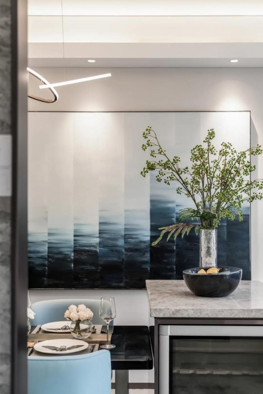 餐厅的墙面上,挂上了一组水蓝色的挂画,契合了餐厅的蓝色主题,似乎让人遥想起了大明湖畔的晚风拂面,十分雅致。而餐桌的另一侧,就是延伸过来的岛台设计,节省空间。