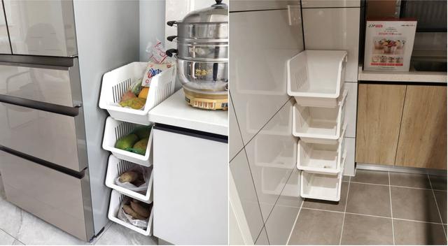 针对填充缝隙收纳,普遍的是夹缝置物架,不过收纳量相对来说比较小,我个人觉得日式的果蔬收纳筐容量更大,也更符合我们国家人口多,爱囤菜的习惯。