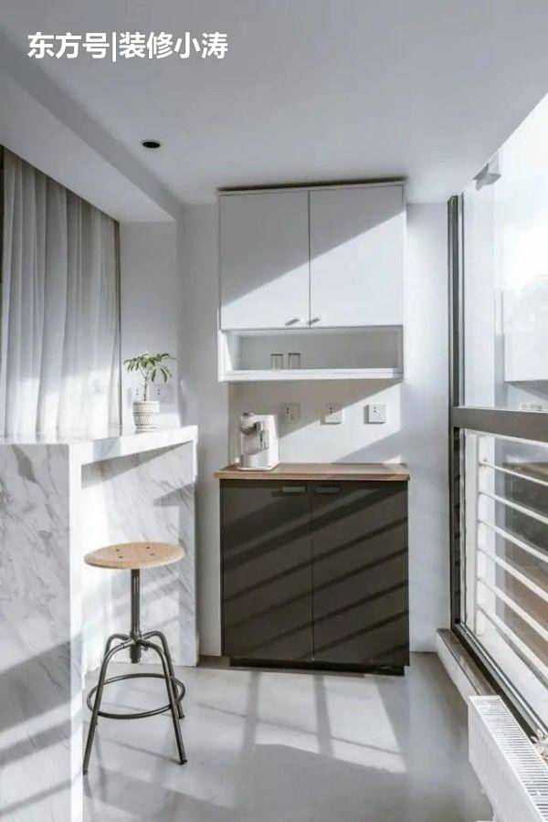 是不是在担心没有餐厅厨房,其实餐厨空间设计在了阳台上,因为主人也不经常做饭,所以餐厨空间小一点也没关系。