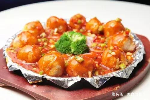 2.锅入油烧至五成热,在香芋丸子表面均匀地裹一层薄薄的干生粉,下油锅炸至表面酥脆,捞出沥油后,放在烧烫且垫有洋葱丝的铁板上面。