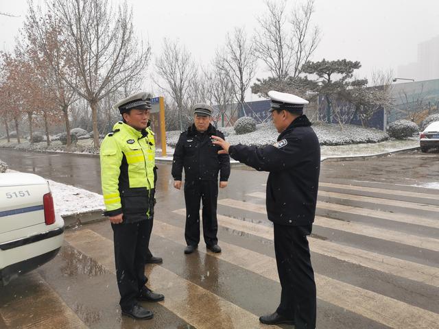 1月15日渭南市普降雨雪,给道路交通管理工作带来了较大压力,为了保证雨雪天气的交通安全畅通,高新交警大队长王晓文、副大队长刘全红以及政办室主任王仲山深入一线督导检查雨雪天气道路保畅工作。