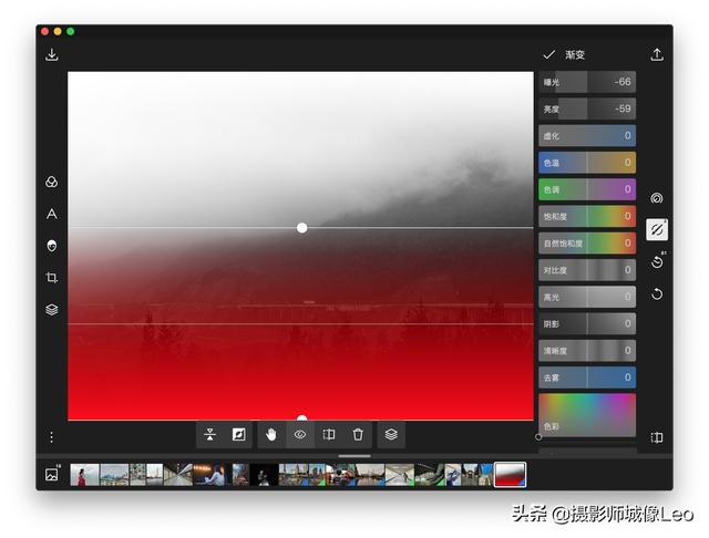 第七步,画面下方的树木也是存在一种灰蒙蒙的感觉,所以使用渐变工具将画面下方的曝光和亮度进行适当的降低,让黑的地方更纯粹一些。