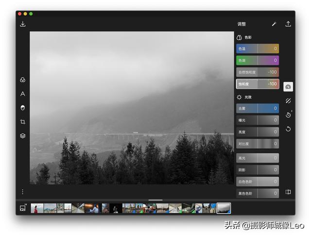 第二步,分析我们的照片。通过上图我们可以清楚的看到照片整体由于大雾天气的原因,整体给人一种灰蒙蒙的感觉。所以我们现将照片进行黑白处理。