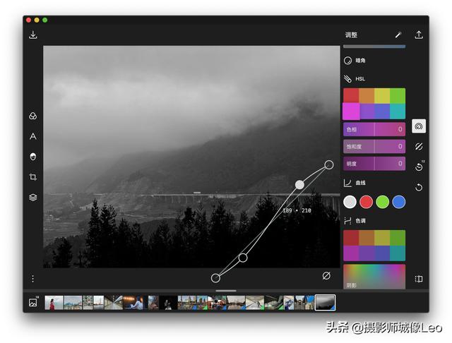 第四步,可以看到相较于一开始的灰蒙蒙,现在前景树木已经有了不错的对比度了。所以我们打开曲线功能,来让这个关系更加的明显。