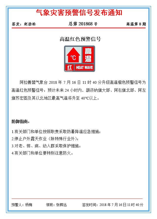 周二(17日):晴,额济纳旗、阿右旗雅布赖、阿左旗苏宏图及其以北地区有40℃以上高温,阿右旗大部、阿左旗北部有37℃以上高温,其余地区有35℃以上高温,偏东风3-4级。