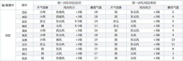今天在西安,咸阳,延安,榆林,渭南,商洛,汉中,宝鸡,铜川,杨凌等地预报有小雨,安康预报有中雨来袭。