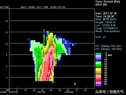 临近预报是比较准确的,但是时效性差一点。临近预报主要通过天气雷达监测(我国冰雹主要发生在汛期,汛期天气雷达是 24 小时开机的,非汛期白天一般都是开机的,夜间根据需要开机;雷达图一般每 6 分钟生成一次),辅助通过卫星云图以及闪电定位的数据(24 小时不间断,卫星云图取决于卫星的位置和姿态,一般是每 30 分钟一张。天气雷达主要监测空气中的可降水粒子,利用天气雷达回波剖面图来分析比较。类似这种