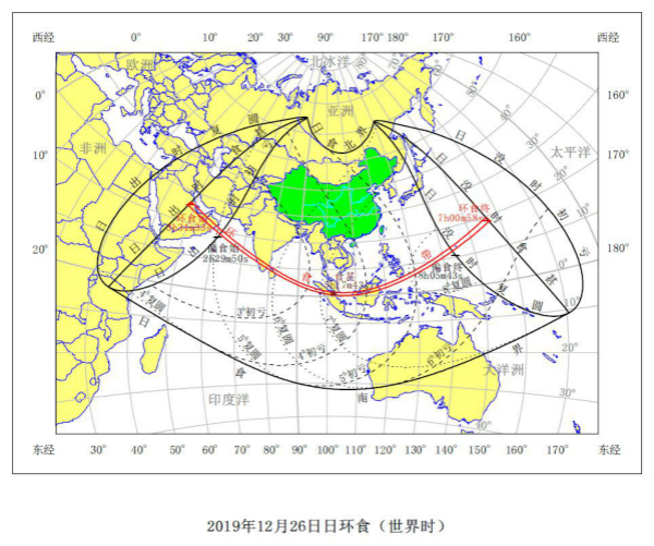 这次日食,环食带从沙特阿拉伯开始,经过卡塔尔、阿拉伯联合酋长国、阿曼、阿拉伯海、印度、斯里兰卡、印度尼西亚、马来西亚、苏拉威西海,在太平洋西部结束。在非洲东北部、亚洲(除北部)、印度洋北部、大洋洲西北部、太平洋西部可以看到偏食。因为我国并不处于环食带区域,因此我国只能看到日偏食,其中上海地区见食时间为26日中午至下午,非常有利于观测。
