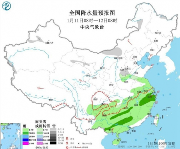 1月11日08时至12日08时,新疆沿天山地区及南疆西部山区、甘肃河西、华北南部等地部分地区有小雪或雨夹雪,局地中雪。西南地区东南部、江淮大部、江南、华南等地部分地区有小到中雨。内蒙古中东部、辽东半岛、山东半岛、青藏高原等地部分地区有4~6级及以上风。东海、台湾海峡有5~7级、阵风8级的偏北到东北风。