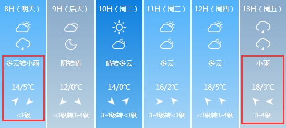 3月9日:全省阴天转多云,大部分地区有小雨或雨夹雪,北部局部地区有中到大雪;全省有4~5级、短时6~7级西北风。最低气温:高寒地区-10℃左右,北部-5~1℃,中南部1~7℃;最高气温:北部5~8℃,中南部8~14℃。