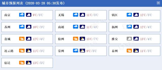 江苏各城市天气预报(数据来源:天气管家客户端)