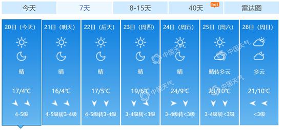 今天,北京依然是北风劲吹的一天,根据市气象台今晨6时发布的预报,今天白天,北京晴,北风4~5级(阵风7~8级),最高气温17℃;夜间晴,北风4级左右,最低气温4℃。