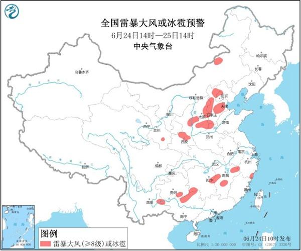 预计6月24日14时至25日14时,陕西中部、山西、河北、北京北部、河南北部等地的部分地区将有8-10级雷暴大风或冰雹天气,其中山西东部、河北、河南北部等地的部分地区伴有20-40毫米的短时强降水;云南东北部、贵州南部、广西中北部、湖南中南部、江西、浙江、福建北部等地的部分地区有短时强降水天气,预计小时雨量30-50毫米,局地可达70毫米以上;其中广西北部、江西中北部局地伴有8-9级雷暴大风。