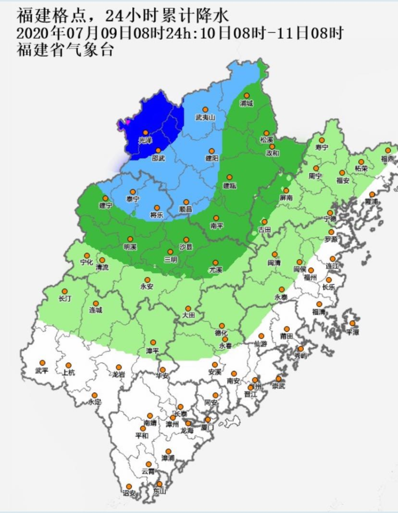 今天,南平市、宁德市大部、三明(建宁、泰宁、将乐、宁化、明溪、沙县)有暴雨到大暴雨,其中光泽和武夷山局部有特大暴雨(24小时累积雨量达50~150毫米,局部250毫米;最大小时雨量可达80毫米);其余地区有阵雨或雷阵雨,局部大雨到暴雨。