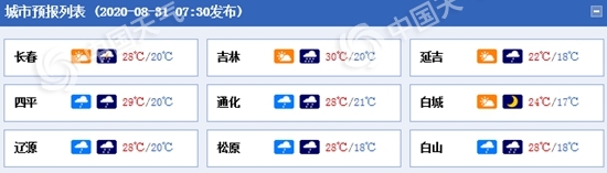 明天白天到夜间,通化东南部、白山南部、长白山保护区有小到中雨,部分地方有大雨,松原东北部、长春、辽源、吉林、通化中北部、白山北部、延边有阵雨或雷阵雨。