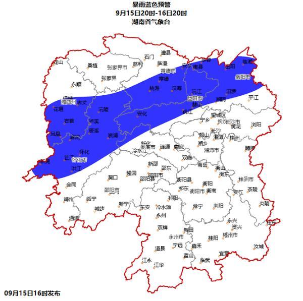 预计15日20时至16日20时,岳阳、常德南部、益阳、怀化、娄底西北部、湘西州南部将出现暴雨。