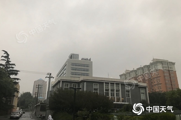 北京今晨天空阴沉,路面湿滑。