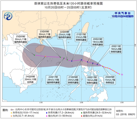中国天气网讯 中央气象台10月20日06时发布热带低压预报: