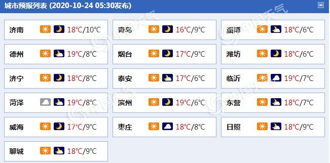 中国天气网讯 未来三天(10月24日至26日),山东全省大部地区晴或多云为主,但鲁中山区、鲁东南和半岛内陆地区等最低气温较低,或有轻霜冻出现,公众早晚出行要注意添衣保暖。