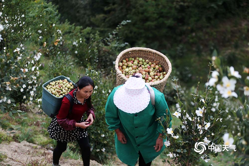 中国天气网讯 金秋时节,重庆市黔江区中塘镇巴弩农业股份合作社胜利村油茶基地的2500亩油茶进入采摘季,饱满的油茶果挂满枝头,漫山飘逸着油茶果的清香。连日来,当地出现持续多日的晴好天气,村民积极抢摘、抢晒油茶果,确保增产增收。(图/文 杨敏)