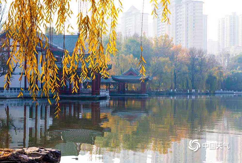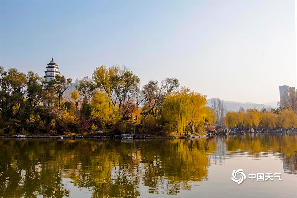 中国天气网讯 深秋时节,青海西宁的大街小巷、公园到处都是金黄秋色。11月3日,人民公园内林木俊秀、叶黄如金,一阵风吹过,湖水碧波荡漾,景色怡人。(图/赵海梅)