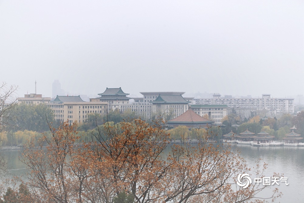 中国天气网讯 今天(11月16日)北京霾天气继续,天空能见度不佳,记者在北海琼华岛远眺太液池,天地间仿佛遮了一层纱,远处建筑物若隐若现。(图/王晓)